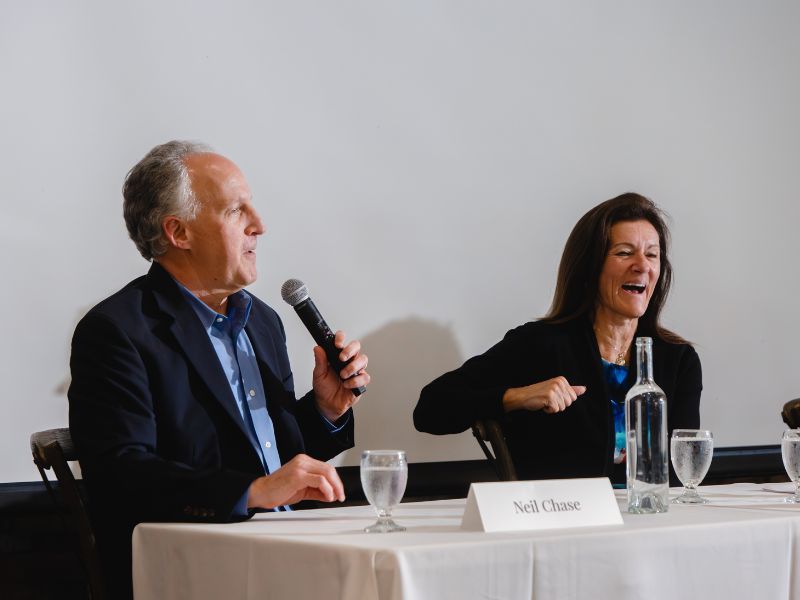- Neil Chase, CEO of CalMatters, and Sara Katz of Katz & Associates share a light moment on the panel.